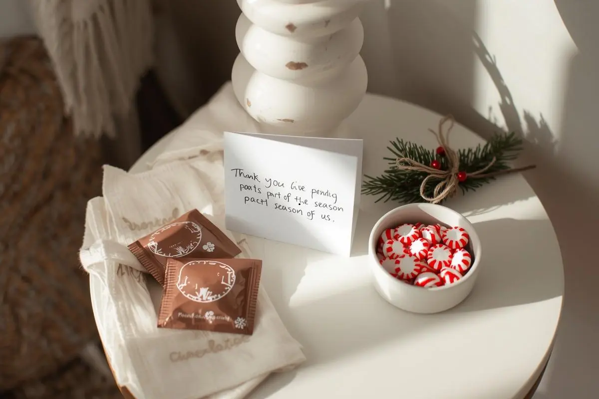 - a simple holiday card on the table (“Thank you for spending part of your season with us.”)